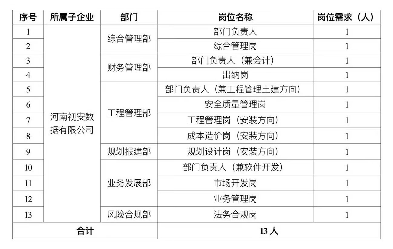 根據(jù)河南鐵建投物流有限公司工作計(jì)劃,為滿足河南視安數(shù)據(jù)有限公司項(xiàng)目建設(shè)運(yùn)營(yíng)人才需求,確保數(shù)字物流綜合服務(wù)多式聯(lián)運(yùn)智慧樞紐項(xiàng)目建設(shè)、倉(cāng)儲(chǔ)、信息化服務(wù)等高鐵物流業(yè)務(wù)順利實(shí)施?,F(xiàn)面向社會(huì)公開(kāi)招聘13人,有關(guān)事宜公告如下: